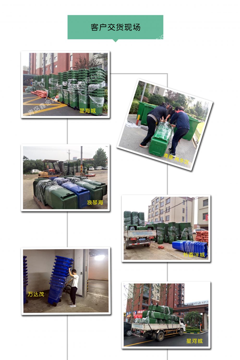 240升塑料垃圾桶采用環保材料特別加厚注塑而成,桶身表面光滑,方便環保人員清理。底部裝有靜音輪子,方便運輸,使用壽命長,可配合和垃圾車使用。適用于:物業小氣、廚房、街邊等。青島鑫金邦垃圾桶質量無憂、信譽有保障,歡迎來電咨詢!