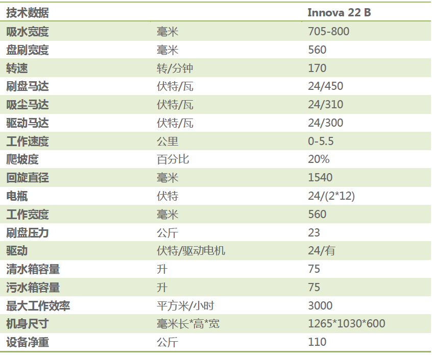 意大利COMAC駕駛式洗地機Innova22B產品特點:1、配備高性能出口型免維護電瓶,使用壽命更久、動力更強,可有效延長連續工作時間。2、節省清潔所用時間,完成1000㎡的地面清洗任務僅需20分鐘。3、清潔效率是傳統人力清洗的幾十倍,并且清潔效果更出色,噪音低,一臺洗地機能節省10幾名工人的開支,有效降低了清潔成本問題,管理維護成本極低,省力、更省錢!4、操作面板簡單、易懂,鑫金邦免費提供上門培訓服務,“保潔大媽也能操作自如”。5、適用環境:小區物業、工廠車間、市政單位、商場、車站機場、廣場、公園、學校、醫院、倉庫、停車場等地。