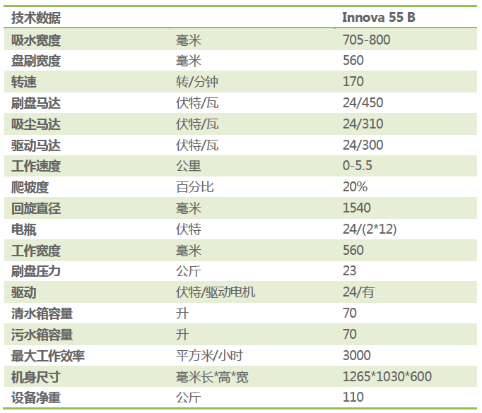 意大利COMAC高美(科邁克)駕駛式洗地機Innova55產品特點:1、配備高性能出口型免維護電瓶,使用壽命更久、動力更強,區別于市面上其他電動掃地機,可有效延長連續工作時間。2、有效縮短清潔所用時間,完成1000㎡的地面清洗任務僅需20分鐘。3、清洗效率是傳統人力清潔的幾十倍,并且清潔效果更出色,一臺洗地機能節省10幾名工人的開支,有效降低了清潔成本問題,省力、更省錢!4、操作面板簡單、易懂,鑫金邦提供免費上門培訓服務,“保潔大媽也能操作自如”。5、適用環境:小區物業、工廠車間、市政單位、商場、車站機場、廣場、公園、學校、醫院、倉庫、停車場等地。